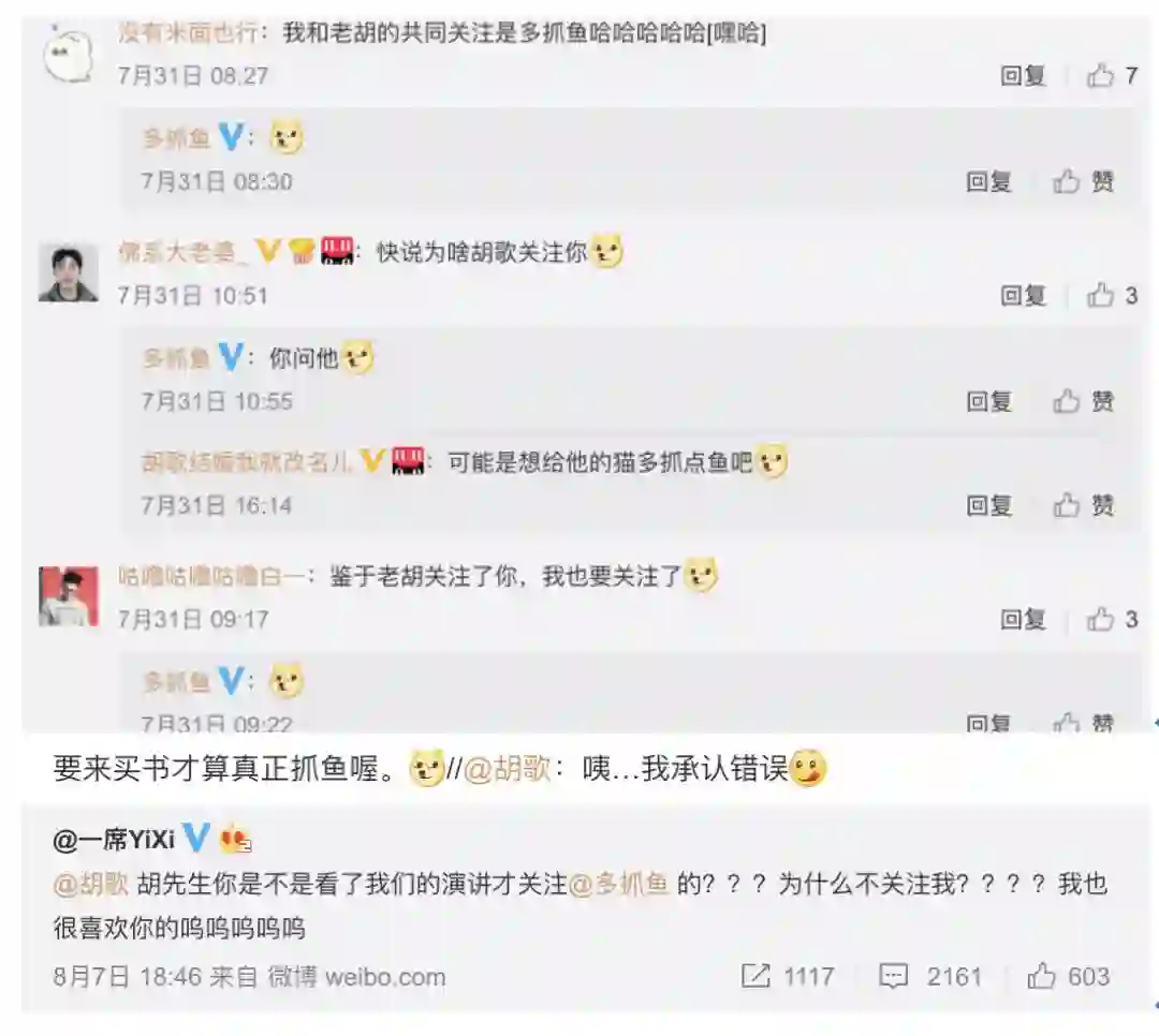 不知道有意还是偶然,因为这篇演讲,胡歌这种非常有号召力的流量咖在7月30日通过微博关注了多抓鱼,并且带动了粉丝关注、使用多抓鱼。