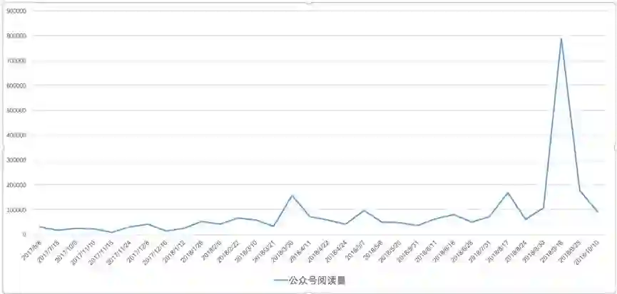 多抓鱼没有App(注:此文写于去年12月初,多抓鱼App于去年12月20日才上线),所以无法得到下载量、日活、月活、应用市场排名等数据,但根据其微信公众号截止2018.10.25共32篇头条推送的阅读数量统计(10万+的文章根据阅读量和点赞数的比例进行了预估),绘制了如下折线图: