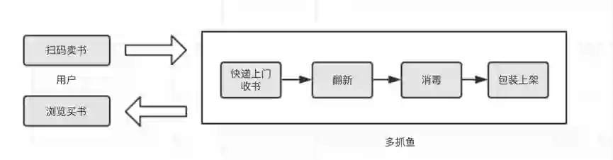 多抓鱼是依托于微信的二手图书书交易平台,以C2B2C 买断模式,用户通过扫码向平台出售不再需要的图书,快递上门收购后,多抓鱼经过翻新、消毒、包装、定价等一系列标准化操作,再将书出售给需要的用户。