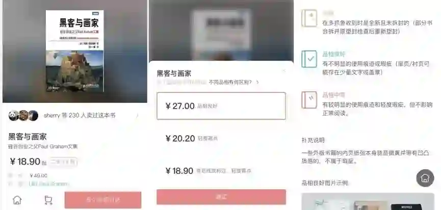 根据品相决定售价,二手书行业自古有之,但八成新、九五新只是一个模糊的概念,业内都没有确定的标准。现在,多抓鱼用了三个档次具体标准来定义,用户可以明确地知道自己收到书的新旧程度,减少了下单的顾虑;对于平台也改变了以前收书品相只能靠运气,品相不佳影响售价的损失只能自身承担的局面,这些都能从一定程度上增加营收。