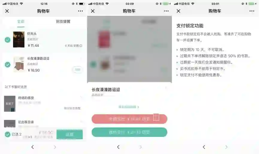 后面就沿用“锁定”功能的逻辑,用户可以选择立即下单发货或是再囤其他的书,过了锁定期,图书会被重新上架。