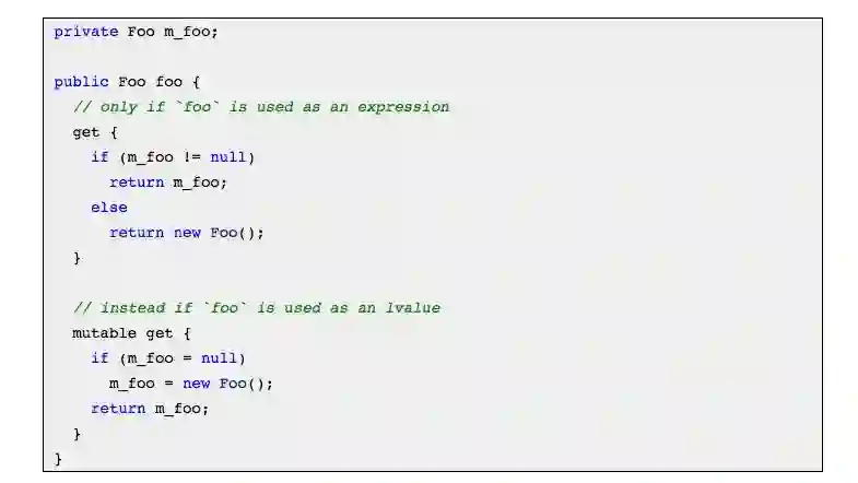 请注意,至少在静态类型语言中,由于方法foo() , set_foo()和has_foo()之间的命名关系, 我们无法抽象处理。 除了预处理器宏之外,我们无法以编程方式生成它们: