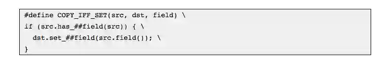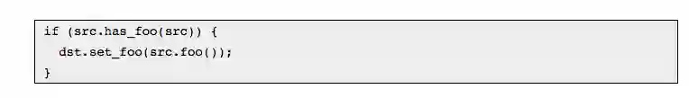 与标量字段不同,我们至少可以检测消息字段是否未设置。 protobuffers提供了生成的bool has_foo()方法。如果想复制foo,则需要编写以下代码: