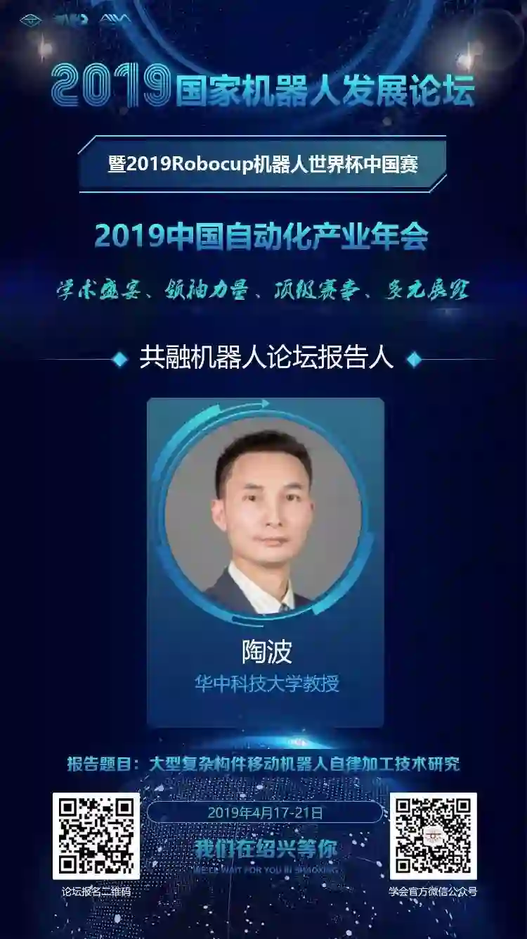 报告人简介:陶波,华中科技大学机械科学与工程学院教授、博士生导师。国家“万人计划”中组部首批“青年拔尖人才计划”、教育部“长江学者奖励计划”青年学者、教育部新世纪优秀人才计划、全国优秀博士学位论文提名奖入选者。2007年华中科技大学机械工程专业博士毕业,2009年博士后出站留校任教。2009年11月晋升为副教授,2013年破格晋升为教授,2013年至2014年在美国加州大学伯克利分校从事访问学者研究,现任中国机械工程学会机器人分会总干事、国家标准化技术委员会委员等。在ASME、IEEE Trans.等期刊发表SCI/EI收录论文40余篇,参与撰写英文专著2本。先后主持国家自然科学基金重点项目、国家“智能机器人”重点研发计划课题、国家重大科技专项、国家973计划课题等国家级重大项目研究。获国家科技进步二等奖和国家技术发明二等奖各1项。主要研究方向:智能制造与机器人技术。