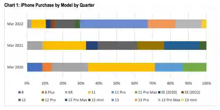 另外在 2022 年 3 月季度中,依然有相当一部分入手了老款 iPhone 手机,其中包括 iPhone 11、iPhone SE 二代和更老的 iPhone XR 等,销售份额占到了 15%。目前网上也爆出了 iPhone 14 系列的消息,不会再有 iPhone 14 mini,而是会原有版本上加入 iPhone 14 Max,拥有更大的屏幕尺寸。