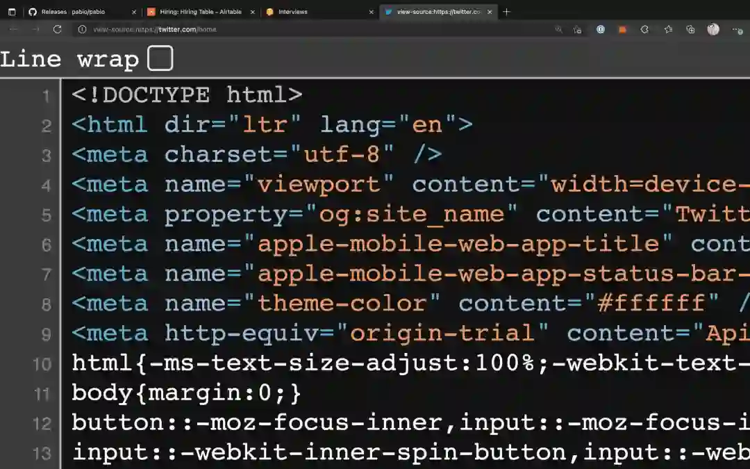 我打开 Twitter.com,点击查看源代码并分享我的屏幕,然后要求他们逐行进行解释,他们想说多少就说多少。我放大了文本,使其更加清晰,所以你看不到整行的内容,不过可以大概有个了解,如下所示: