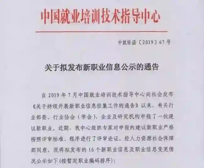 近日,中国就业培训技术指导中心发布了《关于拟发布新职业信息公示的通告》,经人社部同意,拟发布的 16 个新职业已进入公示阶段,其中就包括一项名为「人工智能训练师」的职业。