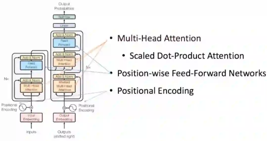 把encoder部分获得的所有输入的信息和decoder前半部分得到的输入信息,一同送到后面这个Multi-Head Attention中,它学习哪些输入信息和之前输出信息的特征更有利于解码,最后还经过了Add & Norm层、Feed Forward层和Add & Norm层,得到了decoder的最终输出。