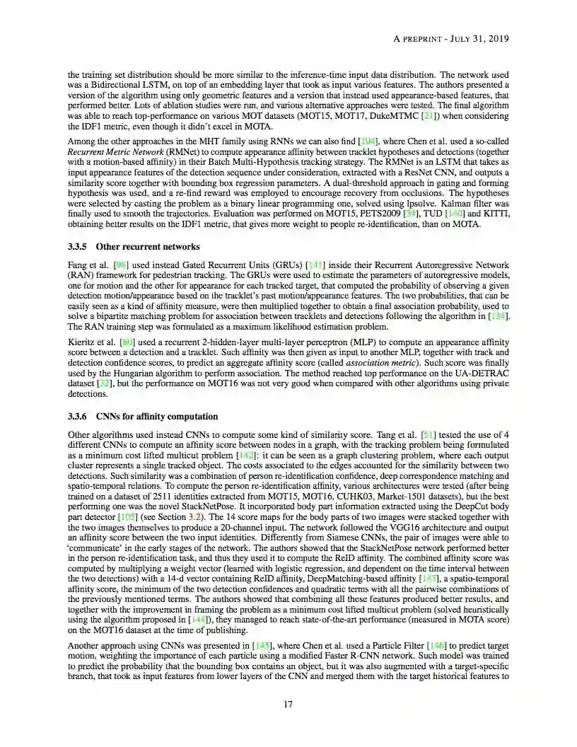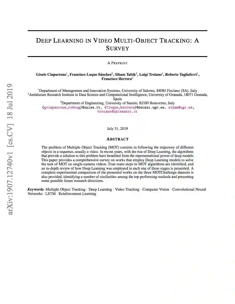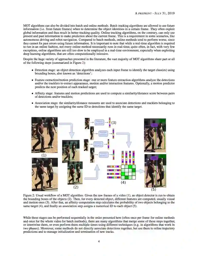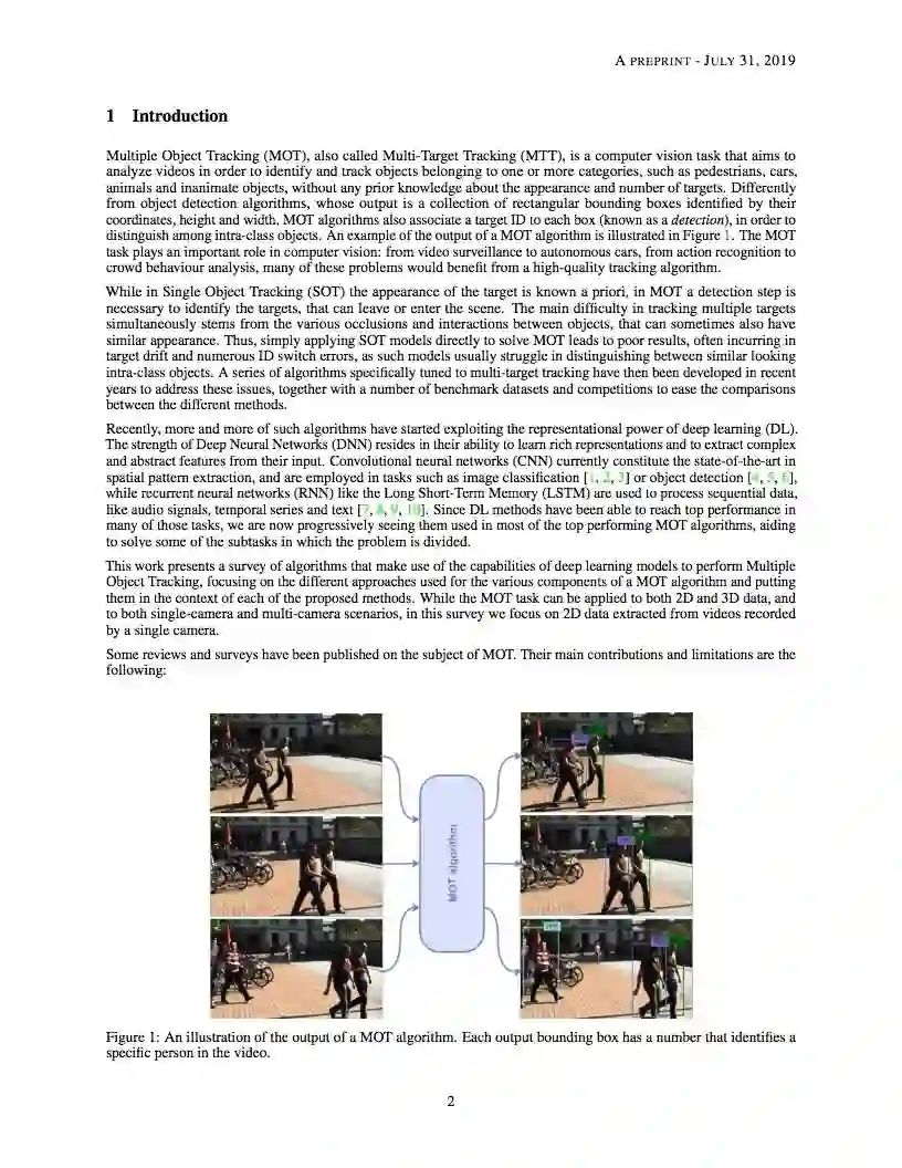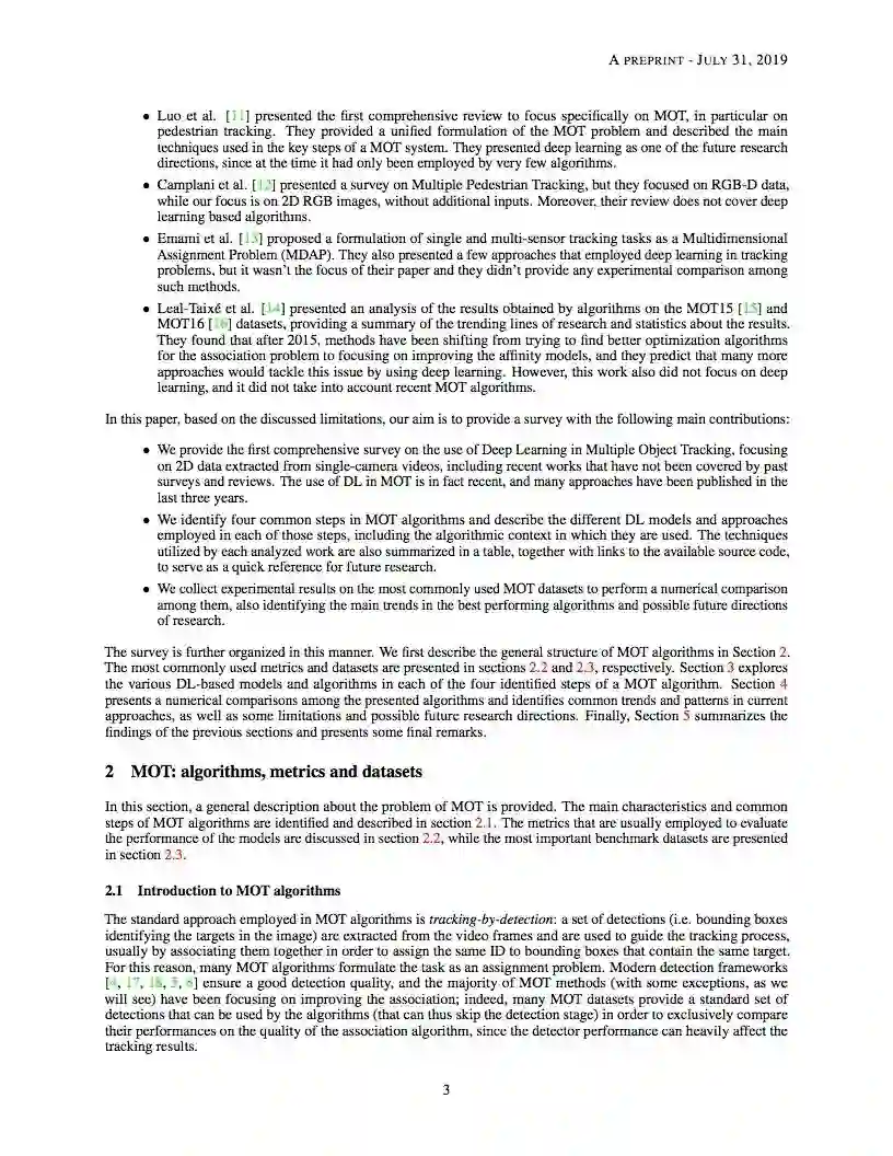 【导读】多目标跟踪(MOT)问题是在一个序列中跟踪不同目标的轨迹,通常是一个视频。本文对采用深度学习模型解决单摄像机视频MOT任务的作品进行了全面的综述。在MOT算法中确定了四个主要步骤,并对每个阶段中如何使用深度学习进行了深入的回顾。本文还对三种MOT Challenge数据集上的研究工作进行了完整的实验比较,找出了一些性能最好的方法之间的相似之处,并提出了一些可能的未来研究方向。