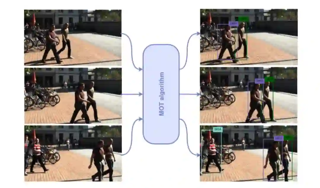 多目标跟踪(MOT)是一个计算机视觉任务,旨在分析视频以识别和跟踪对象属于一个或多个类别,如行人、汽车、动物和无生命的物体,没有任何关于目标的先验知识。与对象检测算法不同的是,MOT算法的输出是由坐标、高度和宽度标识的矩形边框集合,它还将目标ID关联到每个框(称为检测),以便区分类内对象。下图显示了MOT算法的输出示例。MOT任务在计算机视觉中扮演着重要的角色:从视频监控到自动驾驶汽车,从动作识别到人群行为分析。
