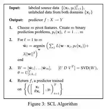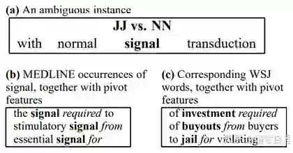 Structural Correspondence Learning(SCL)是比较 General 的方法,它可以应用在目标领域没有带标签数据的场景。这种方法比较 tricky,需要手动的构建 Pivot Feature。所谓 Pivot Feature 就是频繁地在多个跨领域出现并且行为表现也相似的特征。以下面这句摘自 MEDLINE 语料中的句子为例 The oncogenic mutated forms of the ras proteins are constitutively active and interfere with normal signal transduction. 这句话里面的 “signal” 在此处是名词,但如果词性标注模型是用 WSJ 语料训练的,会将其错误的识别为形容词。对比 MEDLINE 语料中 signal 这个词的上下文与 WSJ 语料中名词的上下文,可以发现一些共同的 Pattern,比如都出现在 required、from 与 for 这些词前面,因此可以用这些共同的 Pattern 作为 Feature,训练的模型就可以获得很好的跨领域泛化能力。这些 Pattern 就是 Pivot Feature。