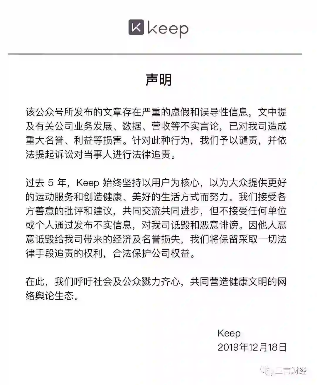 随后,12月18日,Keep公司在其官方微信公众号中发表声明,回应此事。