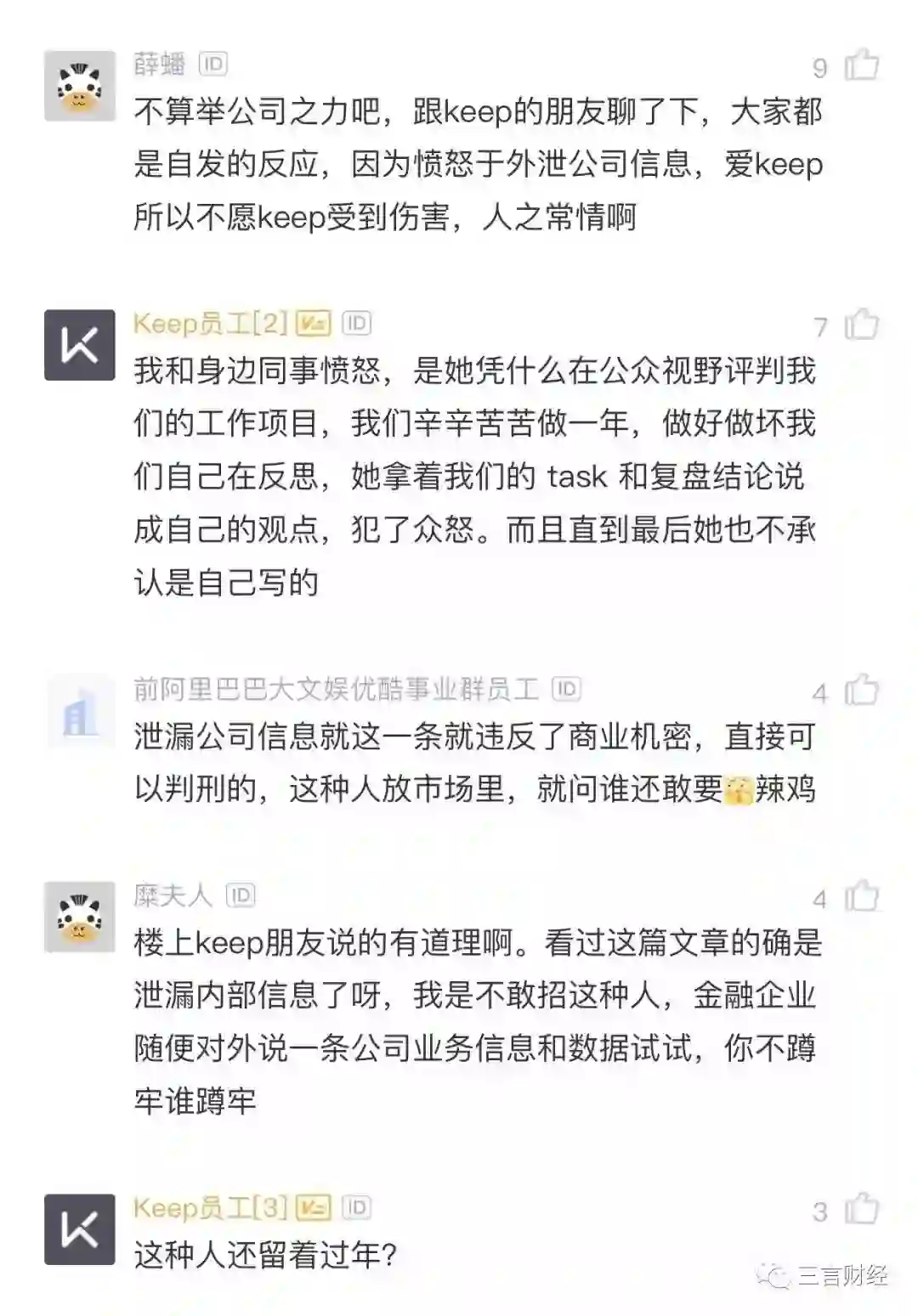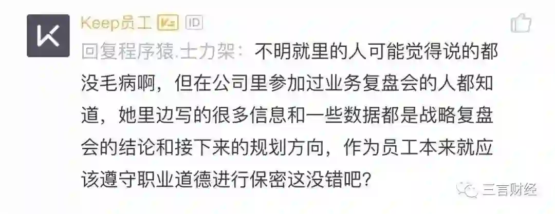在社交平台上,也有认证为Keep公司的员工赞同这名高管的看法,认为文章作者行为属于泄漏商业机密。