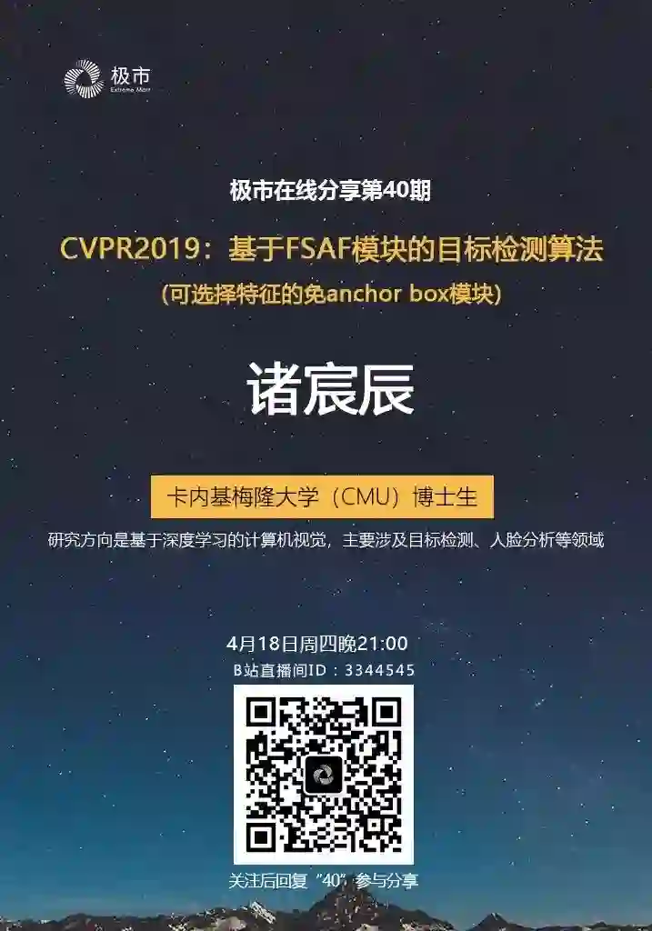 本次分享,极市邀请了CMU(卡内基梅隆大学)的博士生诸宸辰,为我们分享其CVPR2019的工作:基于Anchor-free特征选择模块的单阶目标检测,欢迎各位小伙伴参与直播,与嘉宾互动交流~