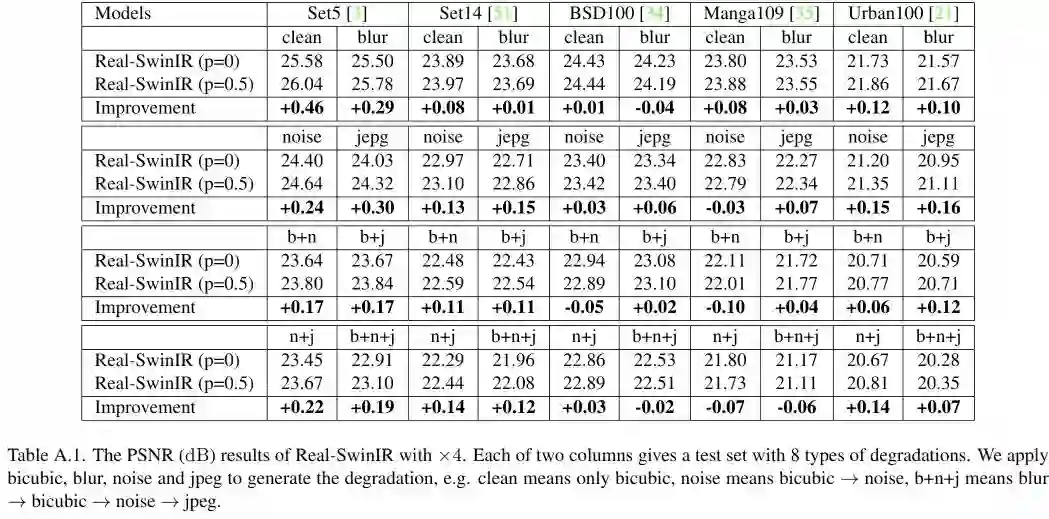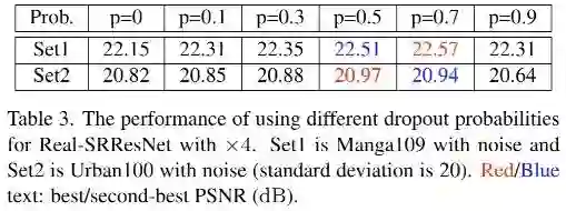在该部分实验中,作者以bicubic退化配置探索Dropout的使用方式。上图给出了关于dropout实用位置、概率以及形式的实验结果对比(注:bicubic退化配置),从中可以看到: