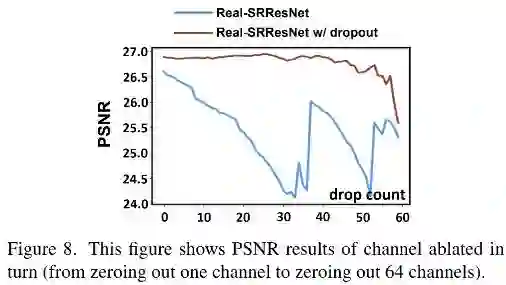 为进一步验证,我们zero某些通道并线性缩放其他特征,结果见上图。可以看到:未使用dropout训练的Real-SRResNet模型性能出现了严重下降;而使用了dropout训练的模型则保持不变。也就是说,对于使用dropout的模型来首,PSNR不再仅仅依赖于特定的几个通道。哪怕丢弃到三分之特征仍可保持性能不变。总而言之,某些特征对于重建更为重要,而****dropout可以平衡不同特征的重要性。