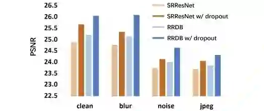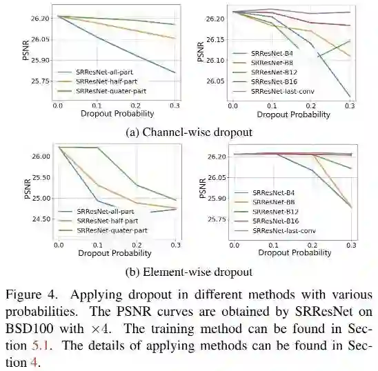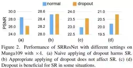 Dropout有助于缓解high-level视觉任务中的过拟合问题,但在low-level视觉任务(如图像超分)中却鲜少应用。作为经典的回归问题,SR具有与high-level任务不同的行为:对dropout操作非常敏感。