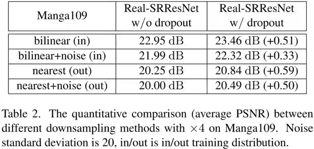 此外,作者还在bilinear、NN及其与噪声组合数据上进行了性能验证。可以看到:对于“域外”测试集(NN),引入dropout仍可以看到可见的性能提升。这说明:Dropout可以提升模型对于未知退化的泛化性能。