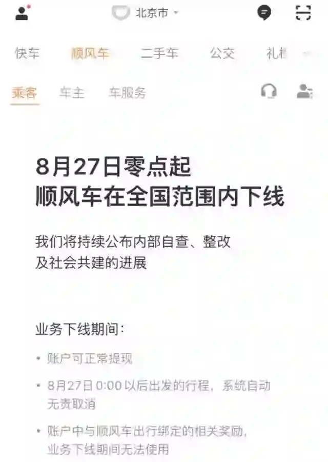 在乐清女孩遇害事件发生后,滴滴宣布从8月27日零时起在全国范围内下线顺风车业务,内部将重新评估其业务模式及产品逻辑。