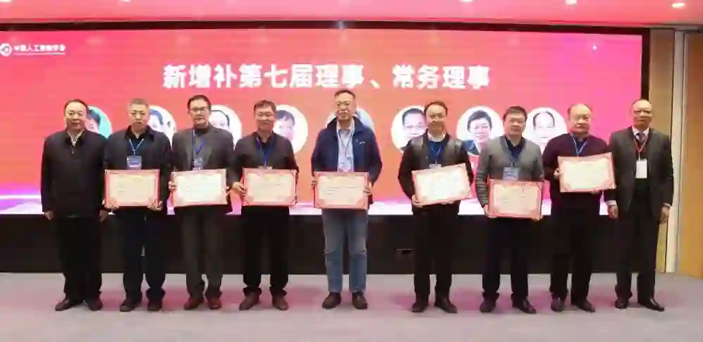 李德毅理事长和赵春江院士为新增补的第七届理事和常务理事颁发证书。