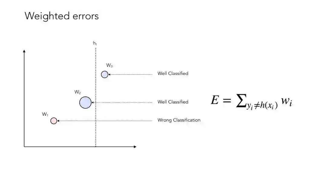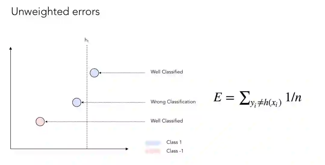 不妨想想二维图像上的数据点。有些点会被很好地分类,有些则不会。通常,在计算误差率时,每个误差的权重为 1/n,其中 n 是待分类的数据点个数。