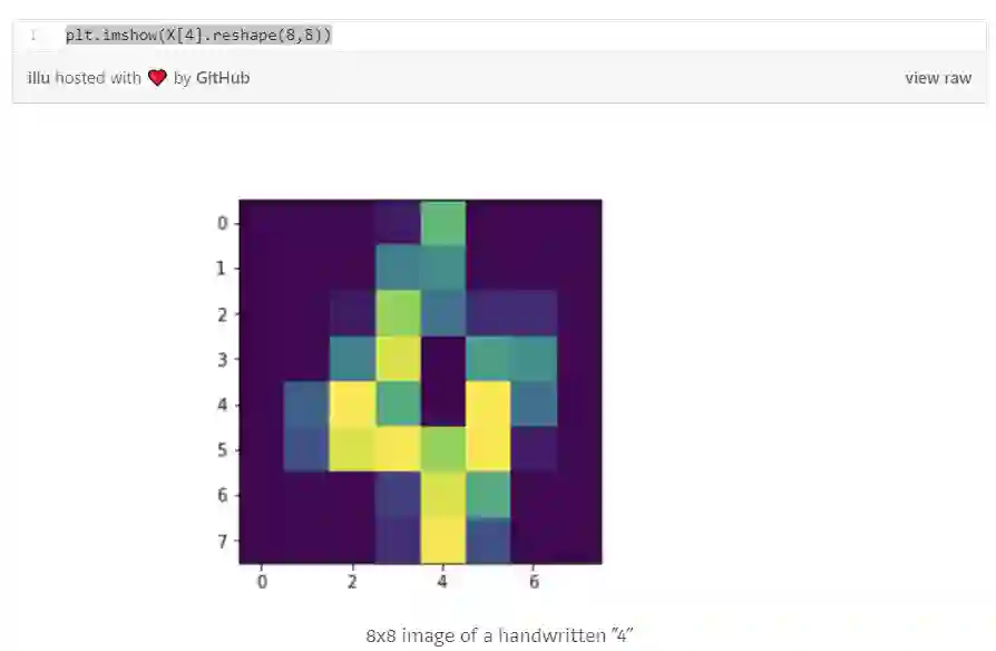 X 包含长度为 64 的数组,它们代表了简单的 8x8 的平面图像。使用该数据集的目的是为了完成手写数字识别任务。下图为一个给定的手写数字的示例:
