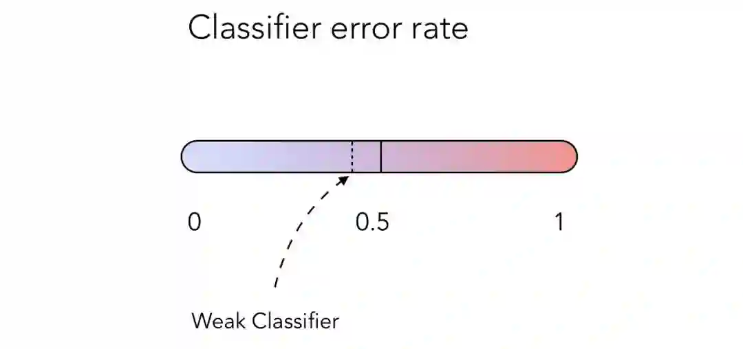 Boosting 方法会随着时间的推移,通过调整误差度量来训练一系列低性能算法,称之为弱学习器。弱学习器指的是那些误差率略低于 50% 的算法,如下图所示: