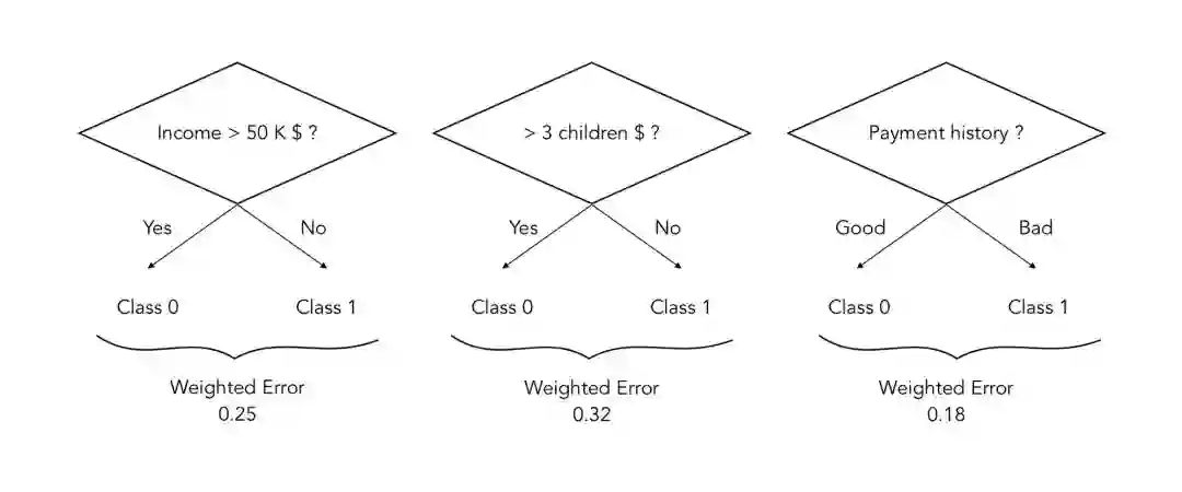 如上所述,通过在每轮迭代 t 中识别最佳弱分类器 ht(通常为具有 1 个节点和 2 片叶子的决策树(决策树桩))来找到最佳划分。假设我们试图预测一个想借钱的人是否会是一个好的还款人: