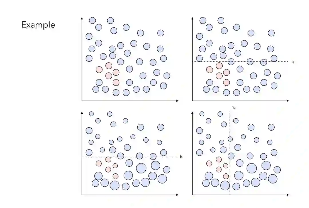 在每一轮迭代 t 中,我们将选择能够最好地划分数据的弱分类器 ht,该分类器能够最大限度地降低整体误差率。回想一下,这里的误差率是一个经过加权修正之后的误差率版本,它考虑到了前面介绍的内容。