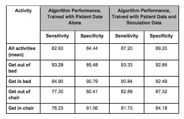 早期频繁的患者移动大大降低了 ICU 后综合征(post-intensive care syndrome)和长期功能障碍的风险。来自斯坦福大学的研究者开发和测试了计算机视觉算法来检测成人 ICU 病房中的患者移动活动。移动活动被定义为将患者移上或移下床、移上椅子或移下椅子。研究者从 Intermountain LDS 医院的 ICU 病房中收集了一组具备隐私安全性的深度视频图像,包含 563 个移动活动实例和 98,801 帧视频数据,这些数据来自 7 个安装在病房墙上的深度传感器。总的来说,67% 的移动活动实例用于训练算法来检测移动活动的发生时间和持续时长以及参与每次移动的医护人员数量。剩下的 33% 实例用来评估算法性能。检测移动活动的算法在四种活动中达到了 89.2% 的平均特异性(specificity)、87.2% 的敏感度(sensitivity)。量化移动活动中医护人员数量的算法达到了 68.8% 的平均准确率。