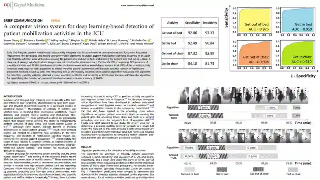 重症监护病房 ICU 是病人和医生争取生命的战场,在美国每年约有 1% 的 GDP 被花费在 ICU 病房里。患者移动可大大降低 ICU 后综合征和长期功能障碍的风险,但相关的具体研究还很匮乏。近日,Serena Yeung、李飞飞等人的论文被自然子刊《Nature Digital Medicine》收录,该研究利用算法估计 ICU 病人移动活动的类型、频率和持续时间,有助于了解移动性干预对重症病人的具体作用,从而有可能降低 ICU 后综合征的风险。