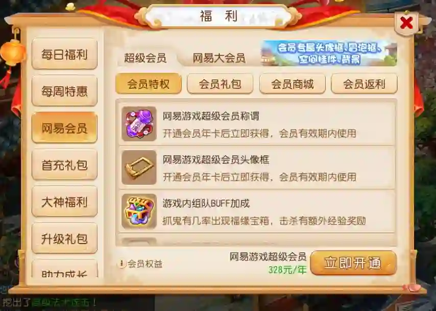 所有网易系游戏的玩家,均可以免费注册成为网易游戏会员。而网易游戏超级会员则是基于网易游戏会员体系的付费服务,定价328元每年。这项服务的最大福利,就是网易旗下30余款游戏的特权服务。