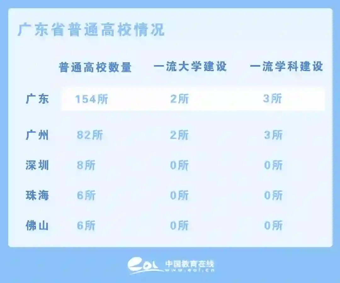 广东省共有普通高等院校154所。其中,广州有本科及高职院校82所,包含2所“双一流”建设高校(中山大学、华南理工大学)、3所一流学科建设高校(广州中医药大学、华南师范大学、暨南大学)。