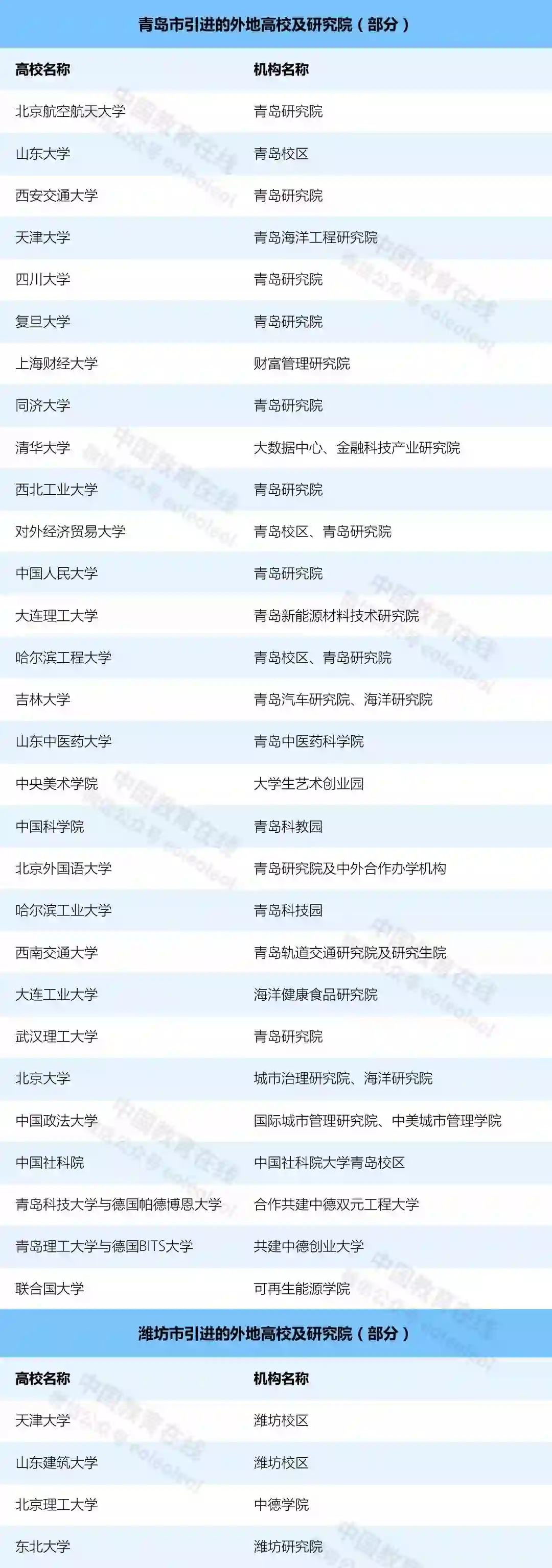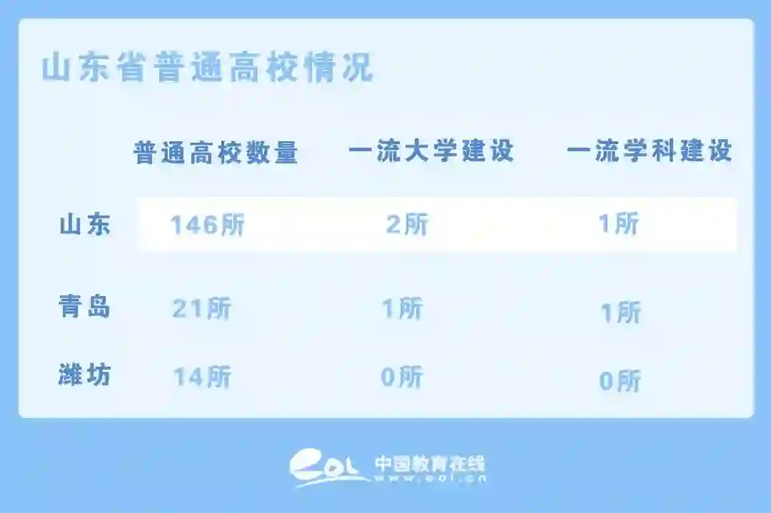 据教育部公布的《全国普通高等学校名单》显示,山东省共有普通高等院校146所。其中,青岛有本科及高职院校21所,包含一所“双一流”建设高校(中国海洋大学)和一所一流学科建设高校(中国石油大学(华东))。潍坊有普通高校14所(包括本科院校2所、高职高专10所)。