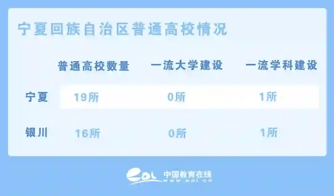 宁夏回族自治区共有普通高等院校19所。省会银川市有本科及高职院校16所,包含一所一流学科建设高校(宁夏大学)。