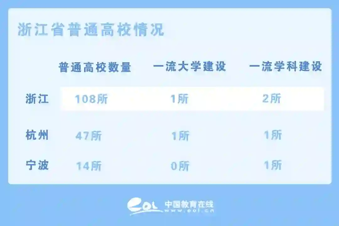 浙江省共有普通高等院校108所。其中,杭州有本科及高职院校47所,包含一所“双一流”建设高校(浙江大学)和一所一流学科建设高校(中国美术学院)。宁波有普通高校14所,其中一所一流学科建设高校(宁波大学)。