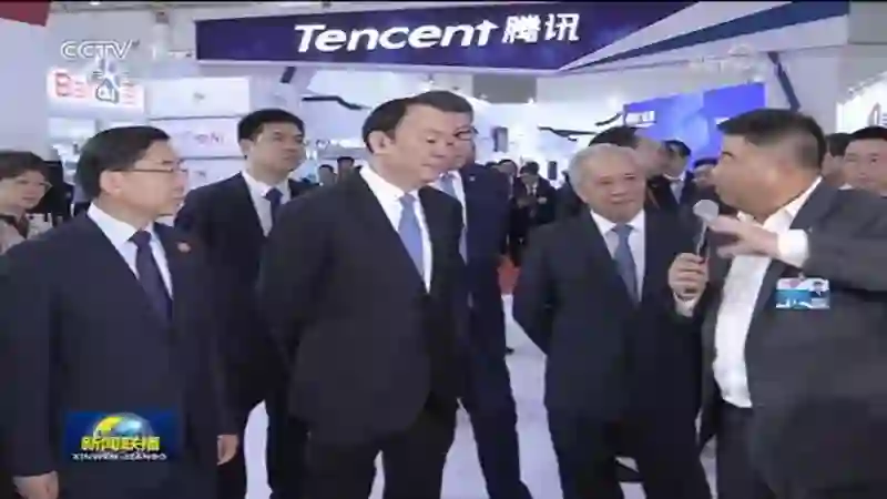 (中共中央政治局委员、中宣部部长黄坤明在展会期间听取京东集团执行副总裁兼首席公共事务官蓝烨汇报京东的最新技术发展以及对实体经济的推动)