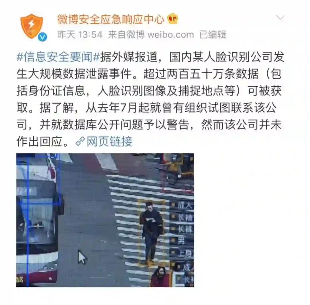 随后,基于国内为数不多的信源之一——「微博安全应急响应中心」微博——的相关报道席卷而来,而在这些报道中,泄露的信息描述中无一例外都包括了「人脸识别图像」信息,部分报道还将其作为标题信息。