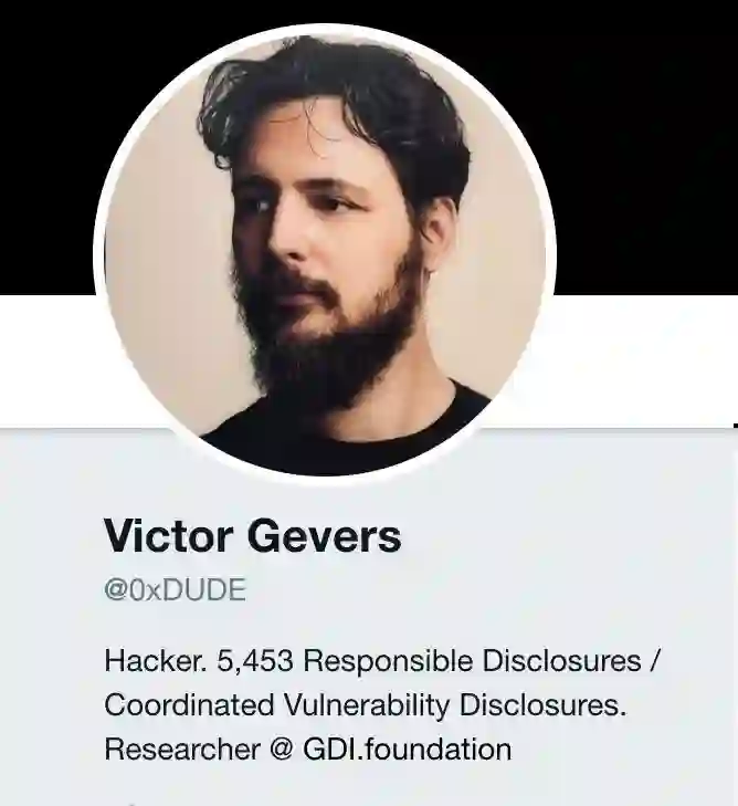 在个人 Twitter 页面,Victor Gevers 在个人介绍一栏说道,一名黑客,主导/参与了 5453 起漏洞事件的披露,目前为 GDI 基金会的研究员。