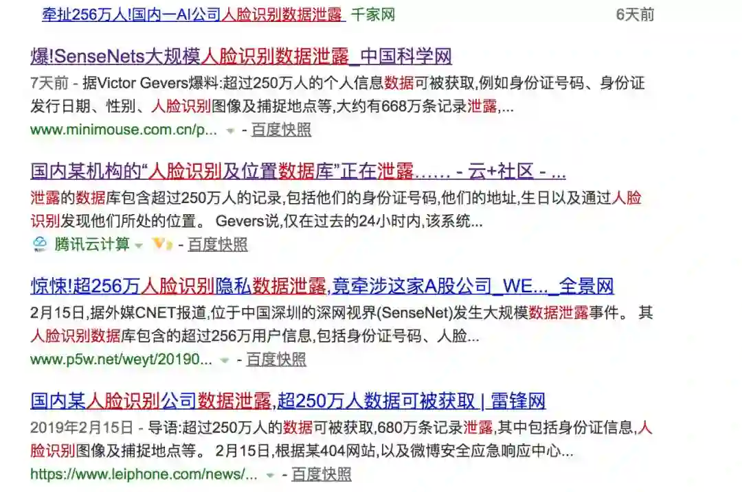 基于「微博安全应急响应中心」的消息,「大规模人脸信息数据泄露」的国内报道甚喧尘上,目前百度上搜索相关词条已达到 190 万。