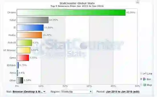 彼时根据美国网站通讯流量监测机构 StatCounter 过去一年的统计数据,Opera 浏览器的市场份额远低于 Chrome 和 Safari,甚至在 UC 浏览器之后。