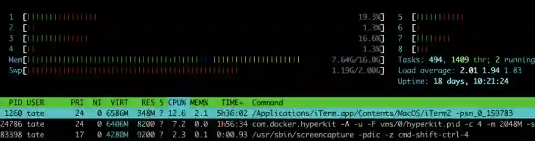 我热衷于 htop 的主要原因是它能快速地提供我所关注的信息。我就是想看看服务器每核 CPU 使用率和内存使用率在图形上是怎样的 - 而不是一个无聊的百分比。