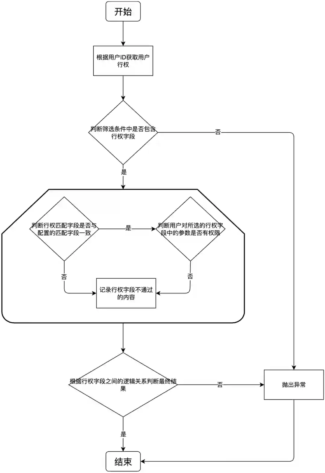 1.用户发起查询时,首先判断用户传入的参数中是否包含行权验证的字段,如果不包含则直接抛出异常,提示鉴权失败;