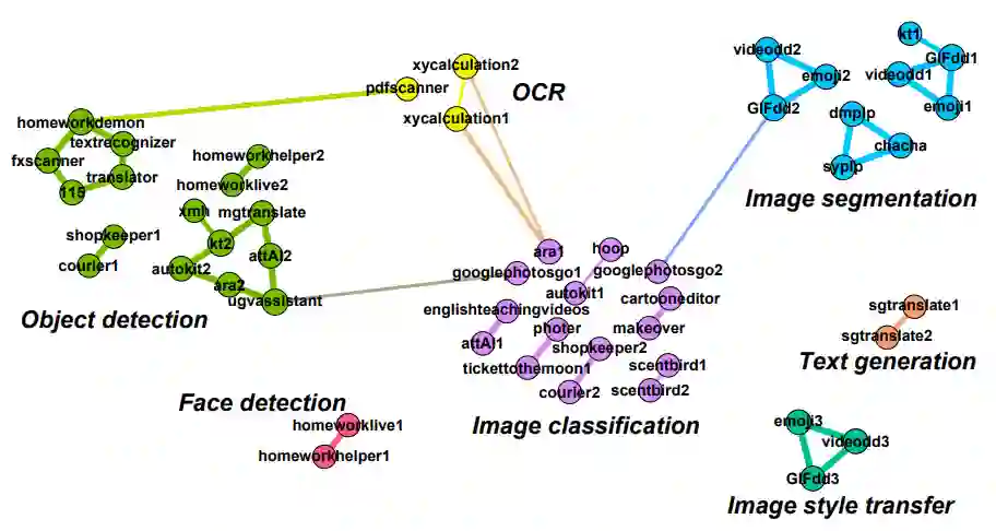 下图 2 具体描述了模型之间的相似关系, 图中的每一个节点代表一个从 App 中抽取的模型,节点之间线的粗细代表模型之间的相似度,线越粗代表相似度越高。