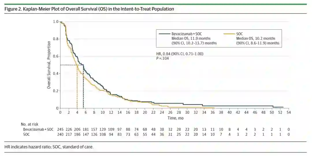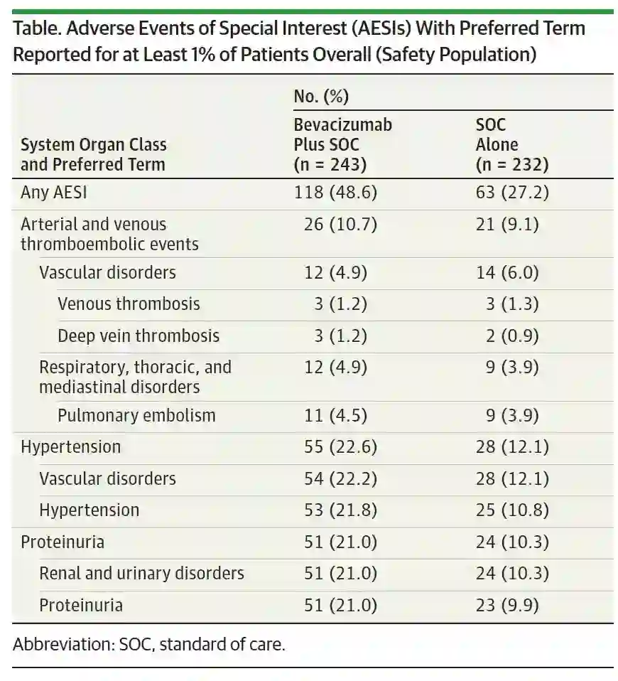 安全性分析:未观察到新的不良事件(AE),值得关注的AE总结见下表。贝伐珠单抗联合标准治疗组对比标准治疗组,值得关注的AE和3-4度AE发生率更常见,分别为48.6% vs 27.2%和76.5% vs 60.3%,总结见表1。两组分别有6.6%和5.2%的患者出现5度治疗相关AE。