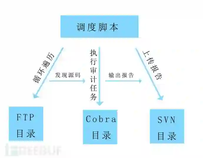 1.mkdir():在SVN目录中根据当前日期安装年月日分级建立目录并同步到SVN,方便后续上传审计报告。2.code_detect():通过循环执行listdir函数,检测FTP目录下是否存在上线源码压缩包。3.code_scan():步骤2中检测到源码包后逐个执行Cobra工具的审计命令:python cobra.py -t code_path -o report_format -o email_addr,任务结束后删除源码包,将报告输出到SVN目录。4.code2svn():将步骤3中输出的报告上传到SVN服务器。