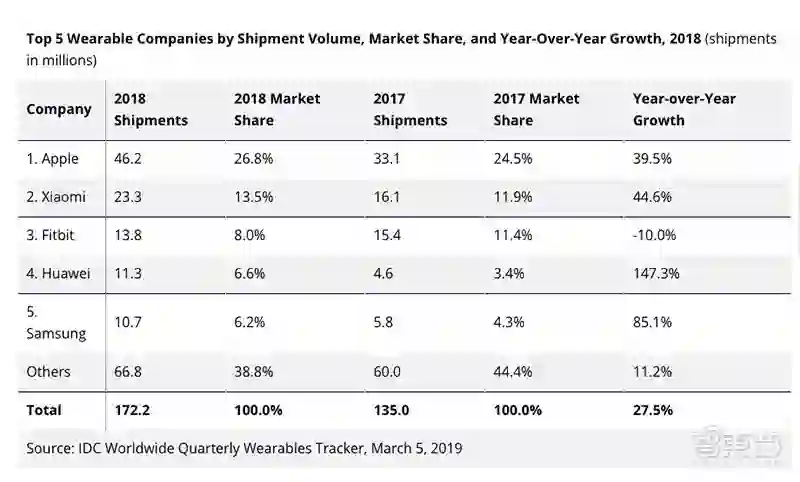 据IDC数据显示,2018年全球可穿戴市场实现了快速增长,出货量增长了27.5%,出货量达1.722亿件。其中市场份额位列前五的厂商中,除第三名Fitbit外,其余四家都是手机厂商。更可怕的是,只有Fitbit一家的出货量在减少,其余厂商都大幅度增长:39.5%、44.6%、147.3%、85.1%。