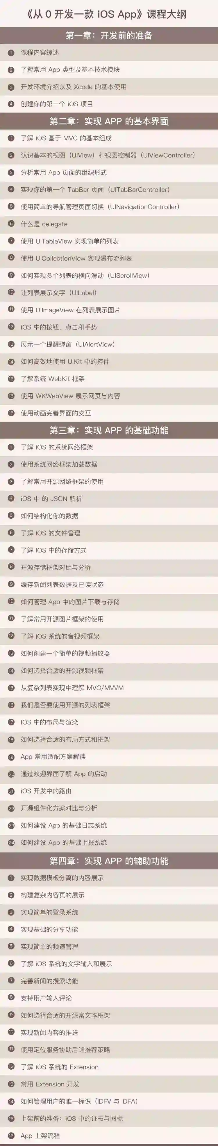 最后,对一些常用的功能进行补充,包括Extension的开发、分享、登录、推送、iOS上架等等,这些模块相对比较独立,但是可以让你对整个App的功能、包括移动开发相关的一些生态有全面的了解。