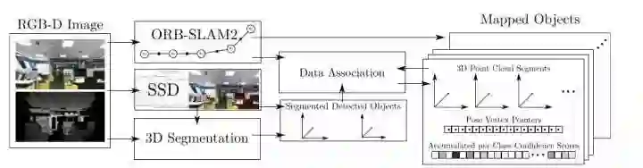 利用现在检测速度很快的SSD,以及基本上可以达到实时定位的ORB-SLAM2相互促进。然后通过把深度图进行划分,物体检测,最终输出带有语义信息的语义地图。个人觉得,本文的难点在数据的融合,也就是流程图的第三部分,两者之间怎么去相互配合。