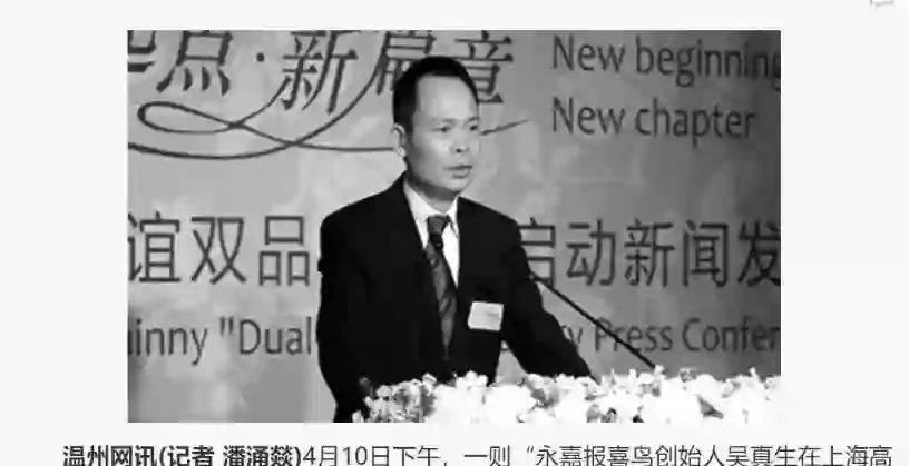 4月10日下午,一则“永嘉报喜鸟创始人吴真生在上海高速去机场的路上发生车祸,不幸遇难”的消息在朋友圈广泛传播,引发不少人的关注。